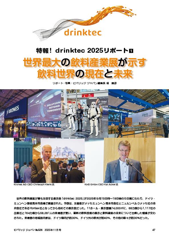 世界の飲料産業が最も注目する展示会「drinktec 2025」が2025年9月15日㈪〜19日㈮の5日間にわたり,ドイツ・ミュンヘン国際見本市会場で開催された。今回は,主催者がメッセミュンヘン見本市会社とニュルンベルクメッセ社の合弁会社であるYontex社となってから初めての展示会だった。11ホール・展示面積74,000㎡に,68カ国から1,117社の出展社と164カ国から58,281人の来場者が集い,最新の飲料技術の展示と飲料産業の未来について白熱した議論が交わされた。来場者の地域別内訳は,ドイツ国内が約30%,ドイツ外の欧州が約40%,その他の国々が約30%だった。