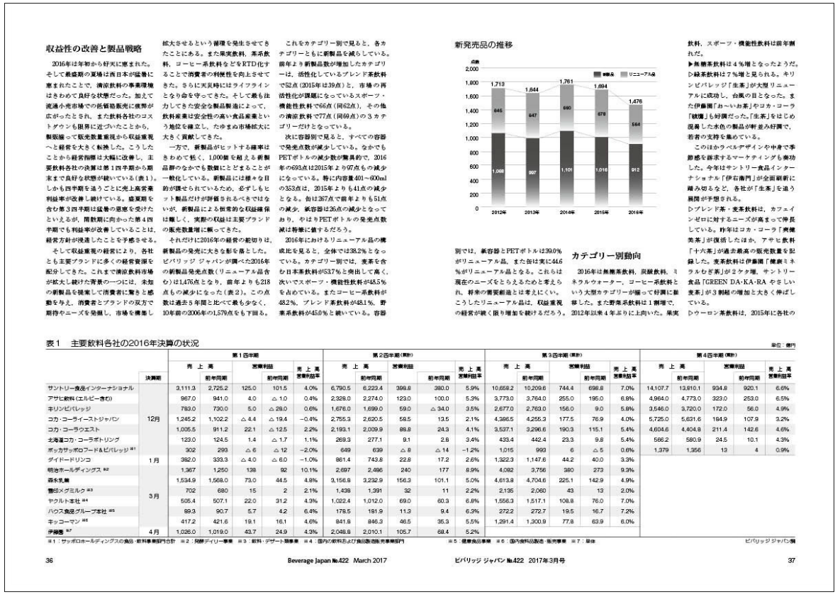 2016年は年初から好天に恵まれた。そして最盛期の夏場は西日本が猛暑に恵まれたことで,清涼飲料の事業環境はきわめて良好な状態だった。加えて流通小売市場での低価格販売に疲弊が広がったとされ,また飲料各社のコストダウンも限界に近づいたことから,製販揃って販売数量重視から収益重視へと経営を大きく転換した。こうしたことから経営指標は大幅に改善し,主要飲料各社の決算は第1四半期から期末まで良好な状態が続いている(表1)。しかも四半期を追うごとに売上高営業利益率が改善し続けている。盛夏期を含む…続きは本誌をご覧ください。
