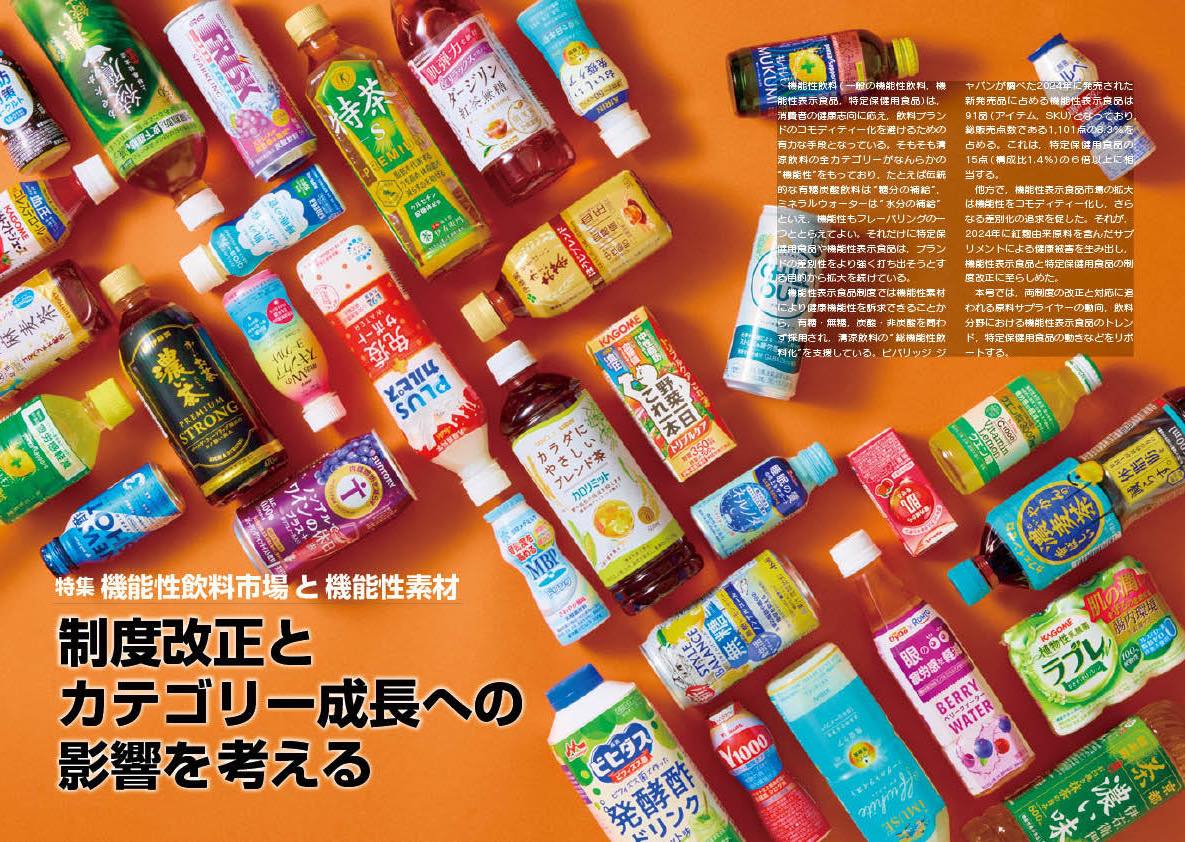 機能性表示食品制度では機能性素材により健康機能性を訴求できることから,有糖・無糖,炭酸・非炭酸を問わず採用され,清涼飲料の“総機能性飲料化”を支援している。ビバリッジ ジャパンが調べた2024年に発売された新発売品に占める機能性表示食品は91品(アイテム,SKU)となっており,総販売点数である1,101点の8.3%を占める。これは,特定保健用食品の15点(構成比1.4%)の6倍以上に相当する。