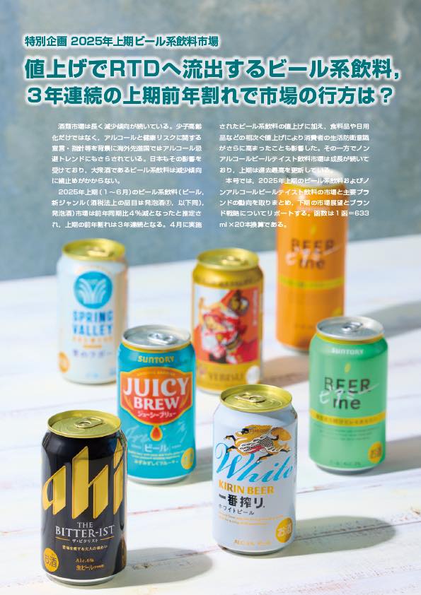 本号では,2025年上期のビール系飲料およびノンアルコールビールテイスト飲料の市場と主要ブランドの動向を取りまとめ,下期の市場展望とブランド戦略についてリポートする。函数は1函=633ml×20本換算である。…続きは本誌をご覧ください。