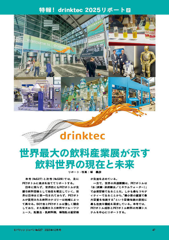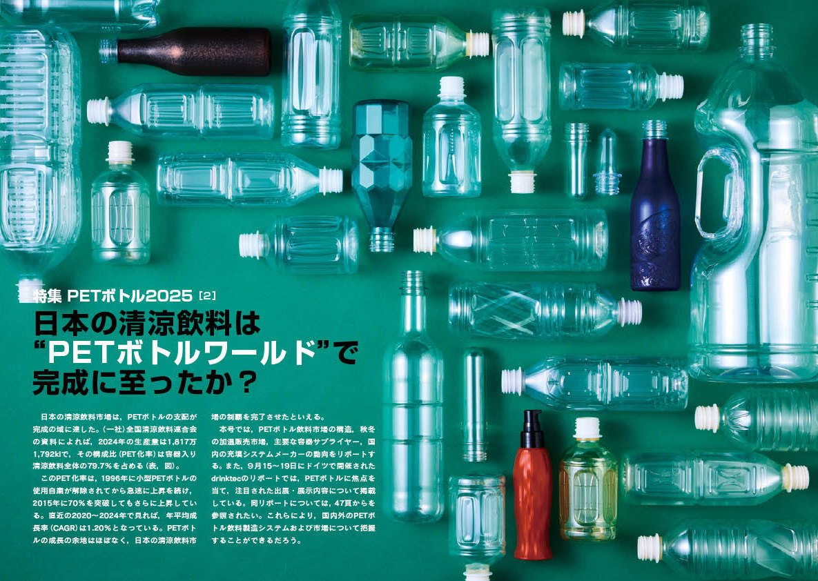 本号では,PETボトル飲料市場の構造,秋冬の加温販売市場,主要な容器サプライヤー,国内の充填システムメーカーの動向をリポートする。また,9月15〜19日にドイツで開催されたdrinktecのリポートでは,PETボトルに焦点を当て,注目された出展・展示内容について掲載している。同リポートについては,47頁からを参照されたい。これらにより,国内外のPETボトル飲料製造システムおよび市場について把握することができるだろう。