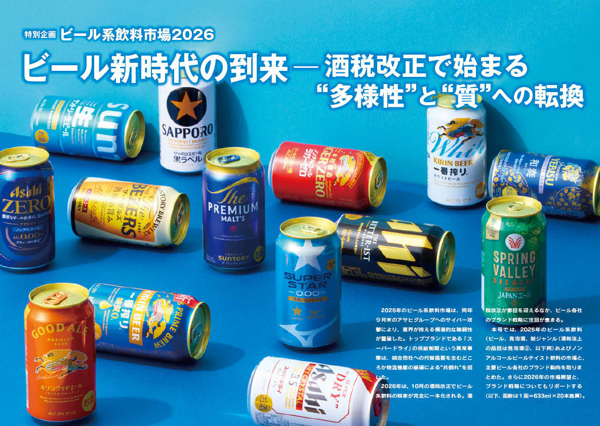 本号では,2025年のビール系飲料(ビール,発泡酒,新ジャンル(酒税法上の品目は発泡酒②,以下同)およびノンアルコールビールテイスト飲料の市場と,主要ビール各社のブランド動向を取りまとめた。さらに2026年の市場展望と,ブランド戦略についてもリポートする(以下,函数は1函=633ml×20本換算)。
