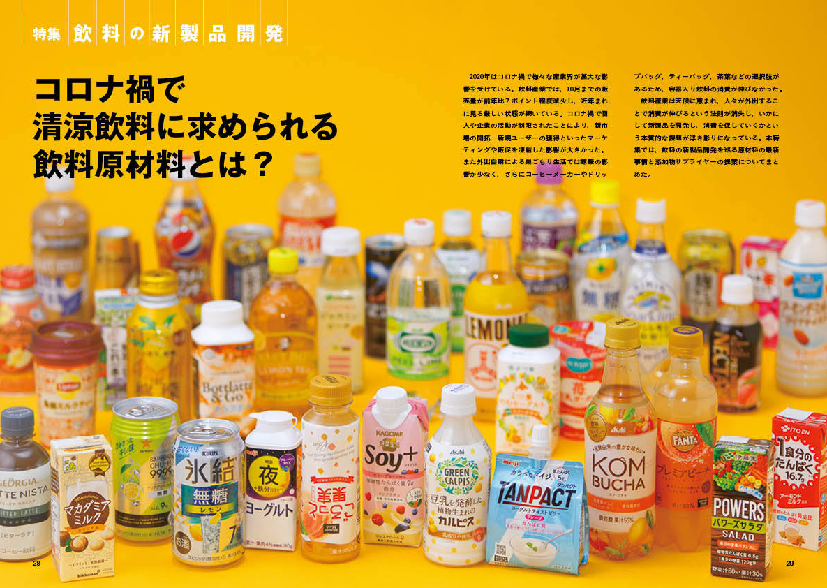 飲料産業は天候に恵まれ,人々が外出することで消費が伸びるという法則が消失し,いかにして新製品を開発し,消費を促していくかという本質的な課題が浮き彫りになっている。本特集では,飲料の新製品開発を巡る原材料の最新事情と添加物サプライヤーの提案についてまとめた。…続きは本誌をご覧ください。