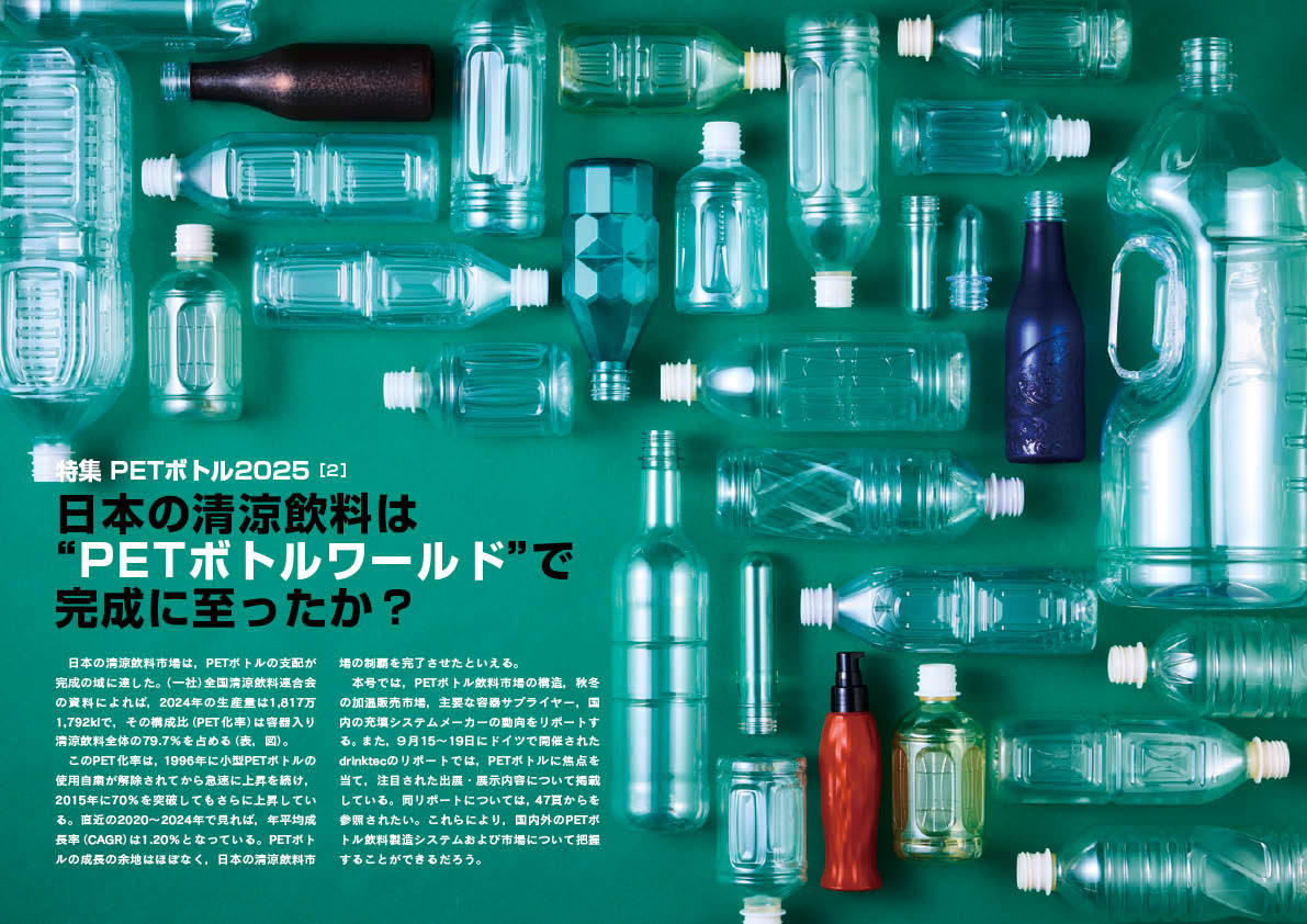 本号では,PETボトル飲料市場の構造,秋冬の加温販売市場,主要な容器サプライヤー,国内の充填システムメーカーの動向をリポートする。また,9月15〜19日にドイツで開催されたdrinktecのリポートでは,PETボトルに焦点を当て,注目された出展・展示内容について掲載している。同リポートについては,47頁からを参照されたい。これらにより,国内外のPETボトル飲料製造システムおよび市場について把握することができるだろう。