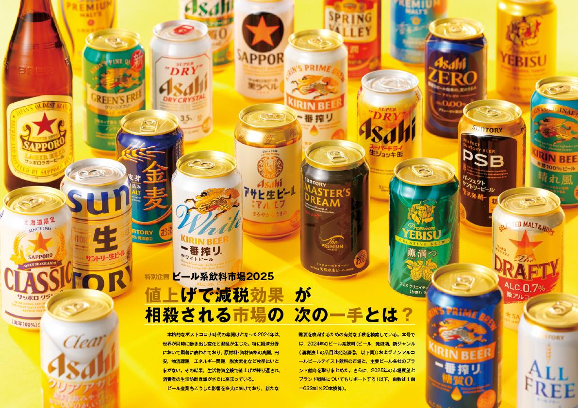 ビール産業もこうした影響を多大に受けており,新たな需要を喚起するための有効な手段を模索している。本号では,2024年のビール系飲料(ビール,発泡酒,新ジャンル(酒税法上の品目は発泡酒②,以下同))およびノンアルコールビールテイスト飲料の市場と,主要ビール各社のブランド動向を取りまとめた。さらに,2025年の市場展望とブランド戦略についてもリポートする(以下,函数は1函=633ml×20本換算)。