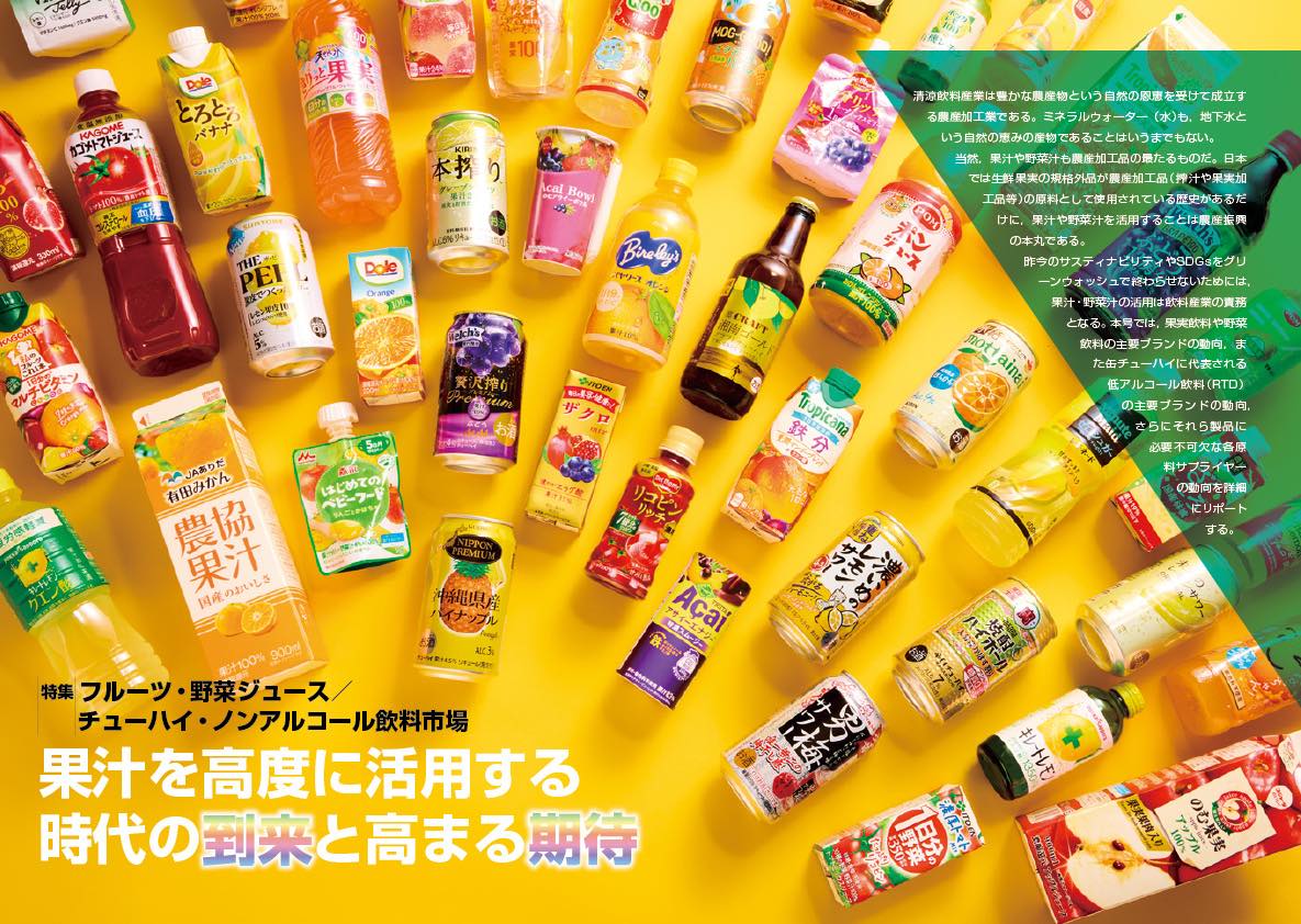 昨今のサスティナビリティやSDGsをグリーンウォッシュで終わらせないためには,果汁・野菜汁の活用は飲料産業の責務となる。本号では,果実飲料や野菜飲料の主要ブランドの動向,また缶チューハイに代表される低アルコール飲料(RTD)の主要ブランドの動向,さらにそれら製品に必要不可欠な各原料サプライヤーの動向を詳細にリポートする。