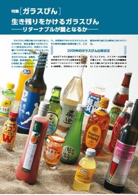 ガラスびん市場の縮小が止まらない。2009年は,総生産量が120万5,012トン(前年比96.6%),本数にして65億8,704万本(前年比97.4%)となった。人類にとって最も古い容器の一つであるガラスびんは,金属缶,プラスチック容器,紙容器など,あらゆる他素材の容器に取って代わられ,そのフィールドは徐々に狭められているといえよう。自然素材で作られるガラスびんは,その根本的価値の転換を図って,この難局を乗り越える必要性に迫られている。